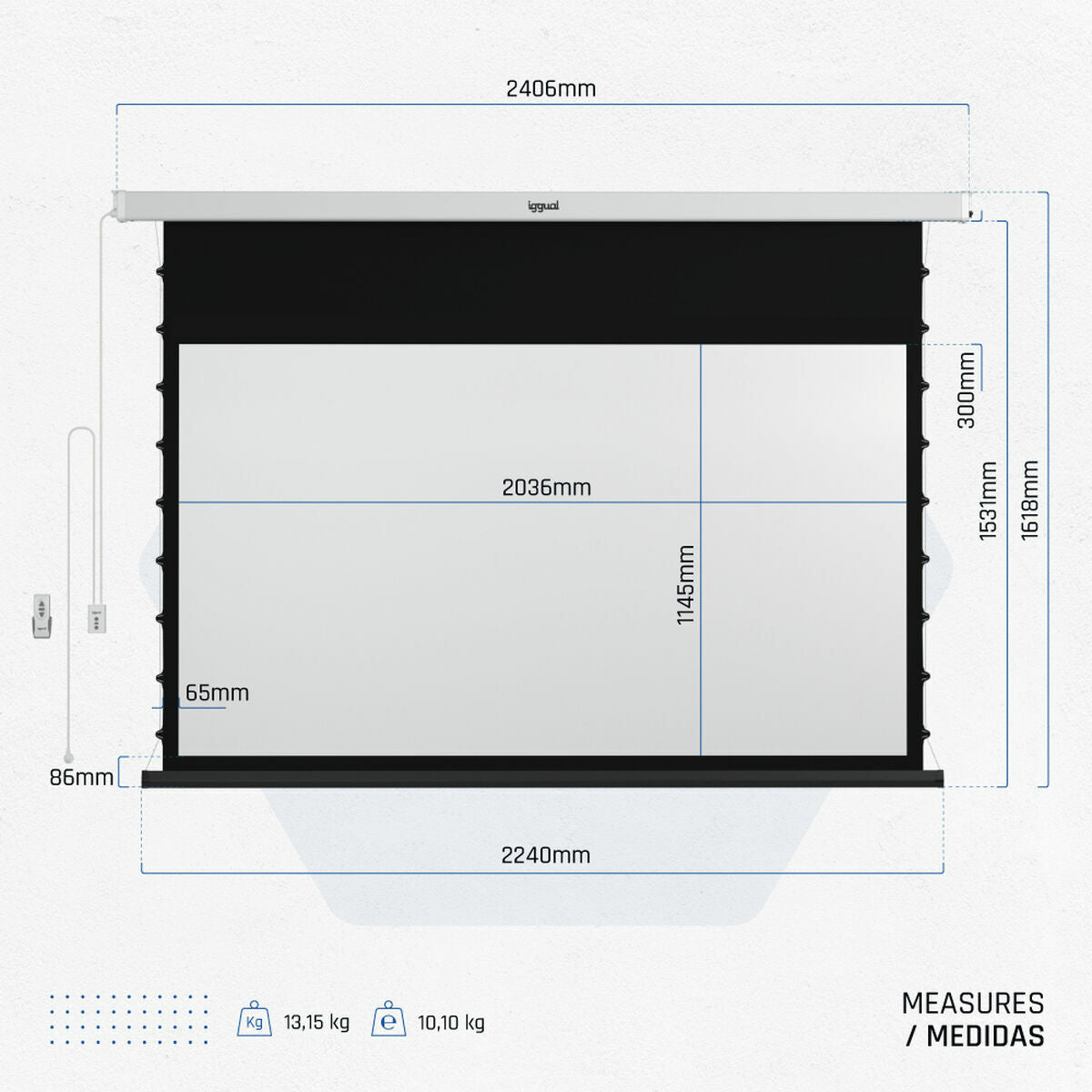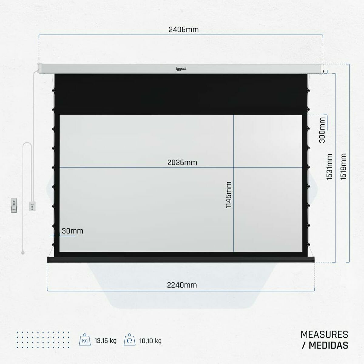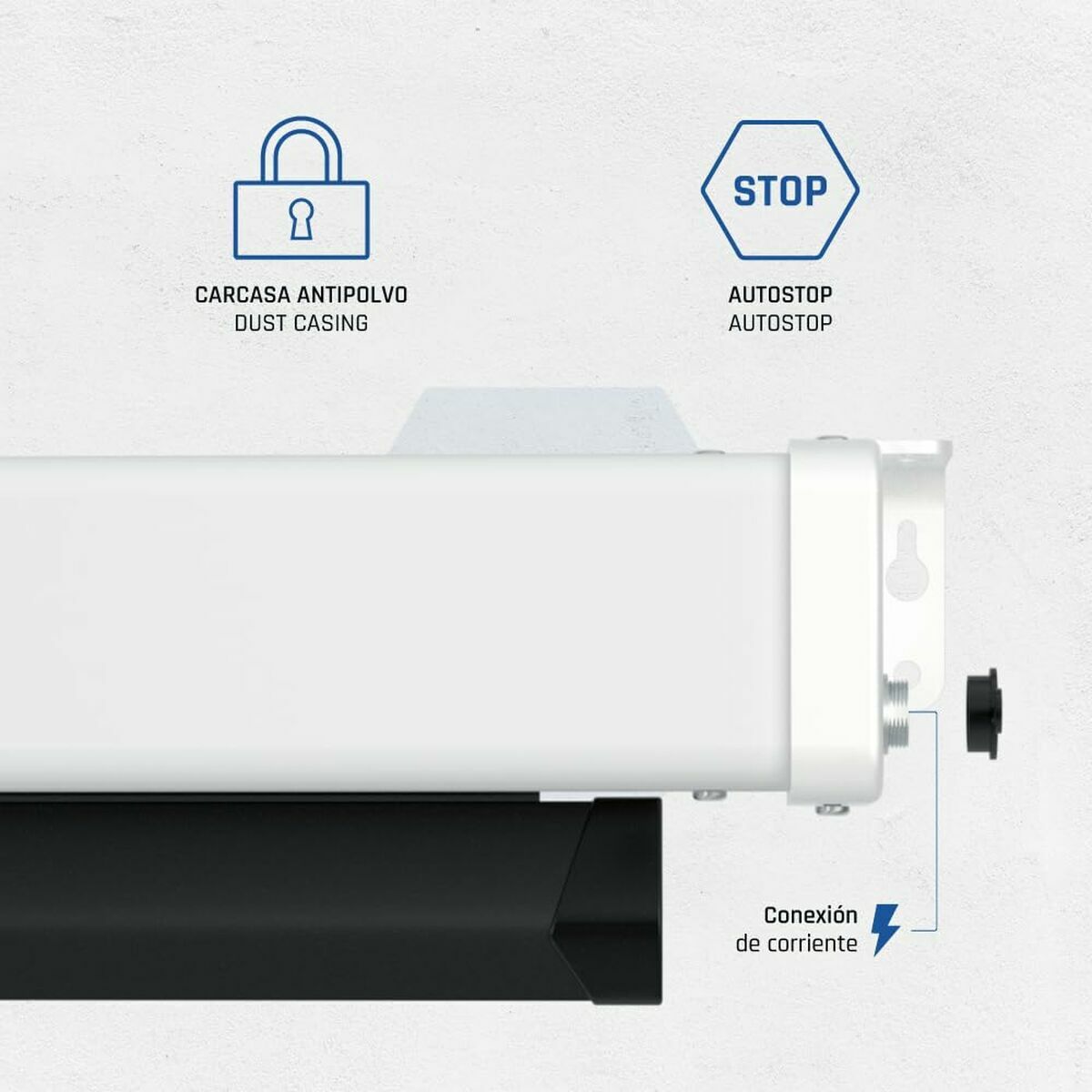 L'Écran Électrique Mural de la marque iggual est une solution polyvalente et pratique pour les installations audiovisuelles en environnements professionnels ou domestiques. Cet écran de projection présente un format 16:9, idéal pour visualiser des contenus en haute définition, avec des dimensions totales de 203 x 114 cm offrant une surface utile diagonale de 92 pouces, parfaite pour les présentations, le home cinéma ou tout type de projection multimédia. Sa structure en couleur blanc mat facilite l’intégration visuelle dans toute décoration, apportant une finition propre et minimaliste. Fabriqué avec une toile de haute qualité adaptée pour capter les images avec un bon contraste et une reproduction fidèle des couleurs, cet écran se connecte directement au réseau électrique avec une tension de 230 V, garantissant un déploiement et un enroulement automatisés et silencieux pour plus de confort et de durabilité. De plus, il inclut une télécommande permettant de contrôler son mouvement sans manipulation physique, améliorant l’expérience d’utilisation et s’adaptant à différentes configurations d’espace. Il dispose également d’une connectivité USB, un détail qui peut faciliter de futures améliorations ou intégrations avec des systèmes externes. Dans l’ensemble, cet écran représente une option équilibrée et fonctionnelle pour les utilisateurs nécessitant une projection de qualité au format panoramique, avec une facilité de manipulation et un design discret qui s’adapte à divers environnements. Sa combinaison de taille, format et automatisation en fait un outil efficace pour les présentations audiovisuelles professionnelles ou pour profiter de contenus multimédias dans des espaces privés.
